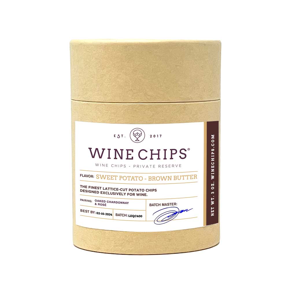 Sweet Potato - Brown Butter - It's a Wine Chip that exudes smooth richness and sweet-savory allure with a heavenly caramel aroma. It's simple yet versatility, this flavor hints at sear-like qualities with a toasty delectability. Perfectly complementing sweet companions, this buttery Wine Chip pairs with dessert wines such as oaked Chardonnay or Rosé.