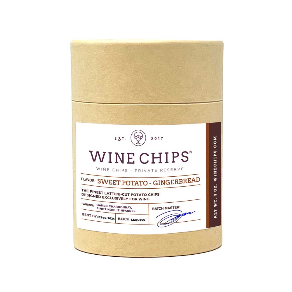 Sweet Potato - Gingerbread - In the realm of holiday favorites, we couldn't overlook one of the most recognizable flavors this holiday season. Imagine that unmistakable sweet-toasty snap of gingerbread in a sweet-potato-based Wine Chips now paired with wine. Ideal with Pinot Noir, Zinfandel, or oaked Chardonnay, this chip promises a sweet and delightful experience.