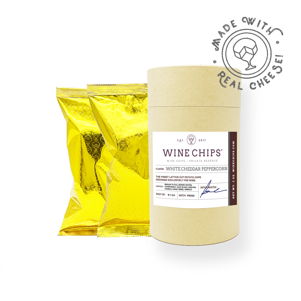 It's delicate yet robust flavor profile enhances the nuances of our suggested wines, creating a symphony of fruit and spices. Whether you're enjoying a casual gathering with friends or a formal wine tasting, our White Cheddar Peppercorn Wine Chip is sure to impress even the most discerning palate especially when paired with medium to full-bodied white wines. Treat yourself to a truly unforgettable pairing experience with this exciting addition to our Wine Chip Private Reserve collection.
